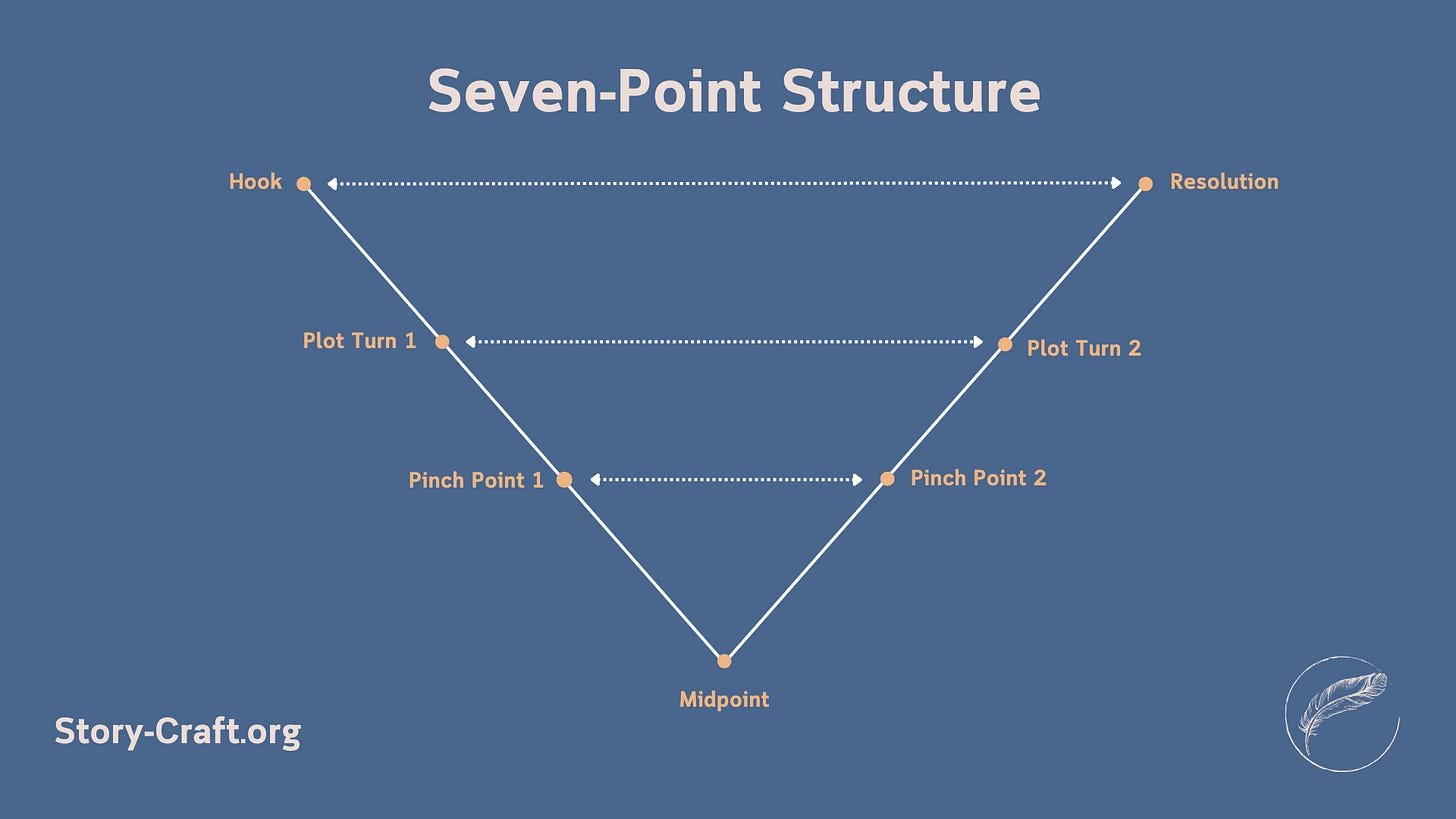 Seven-Point Structure is a simple structure that builds out from the largest moments of your story. You start with your Hook, Resolution and Midpoint. Then, you add in your Plot Points to complicate the story. Lastly, the Pinch Points are added to create additional conflict and boost the stakes.