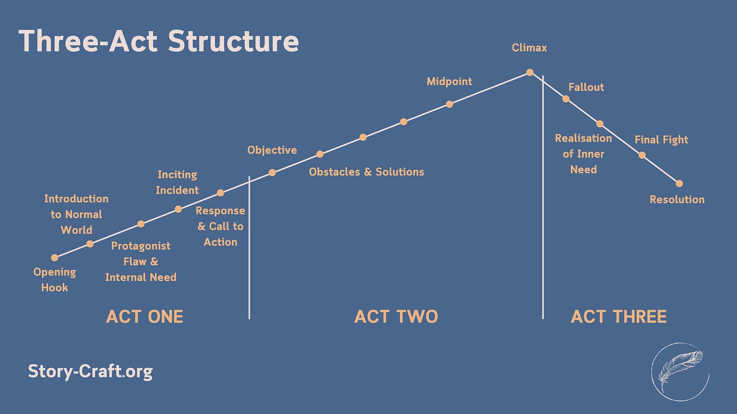Three-Act Structure is common in screenwriting, and was born from The Hero’s Journey. It’s a tight way to develop a story where a flawed Protagonist must overcome obstacles and eventually realize their inner need.