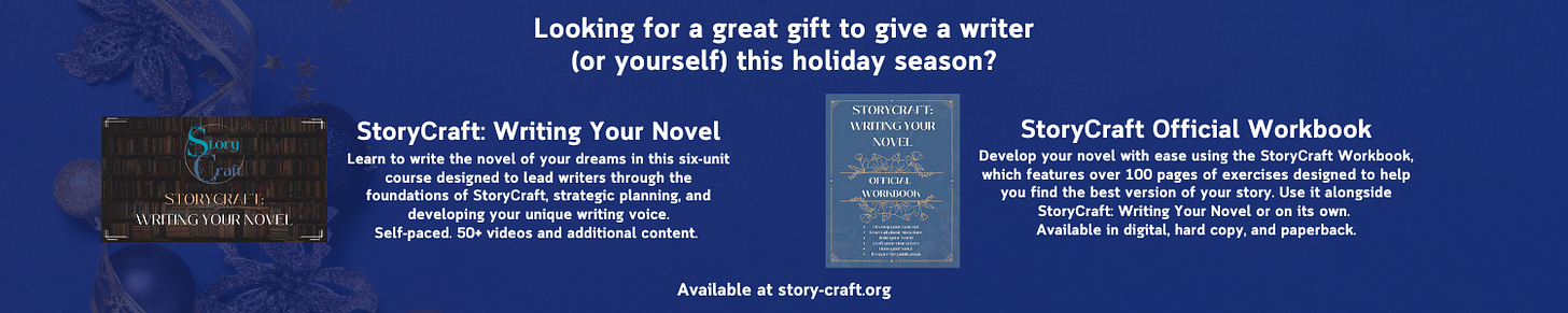 Follow us on Substack, Instagram, Facebook, or Bluesky for a chance to win a FREE StoryCraft Workbook as well as a live feedback session to talk through your novel!